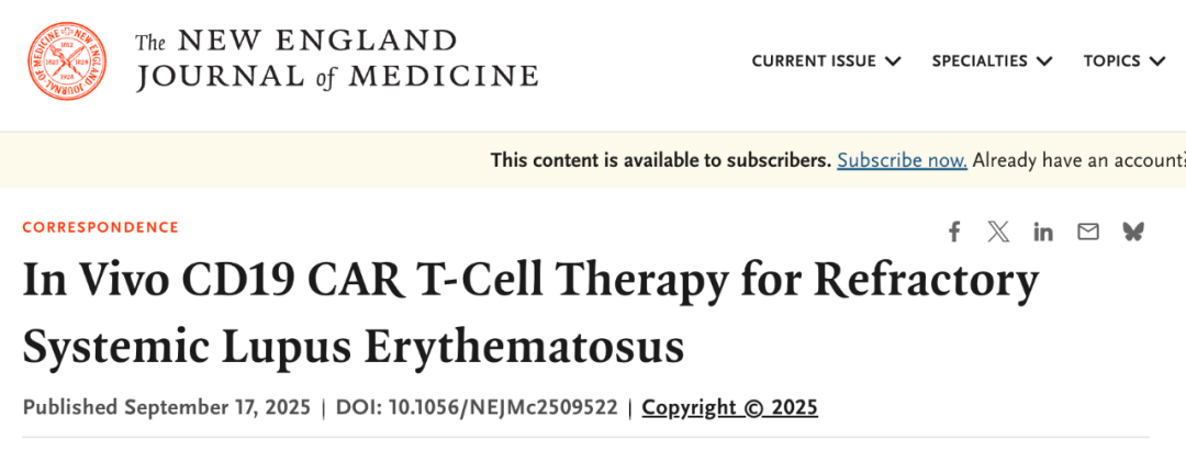北京时间2025年9月18日,国际权威医学期刊新英格兰医学杂志(The New England Journal of Medicine)在线发表了中国科大附一院(安徽省立医院)风湿免疫科陈竹教授团队的创新性临床研究成果——In vivo CD19-CAR T-Cell Therapy for Refractory Systemic Lupus Erythematosus。该研究在全球范围内首次报道了基于LNP的体内CAR-T技术治疗难治性系统性红斑狼疮的初步结果,标志着我国在自身免疫病前沿治疗领域取得重要原创性突破。