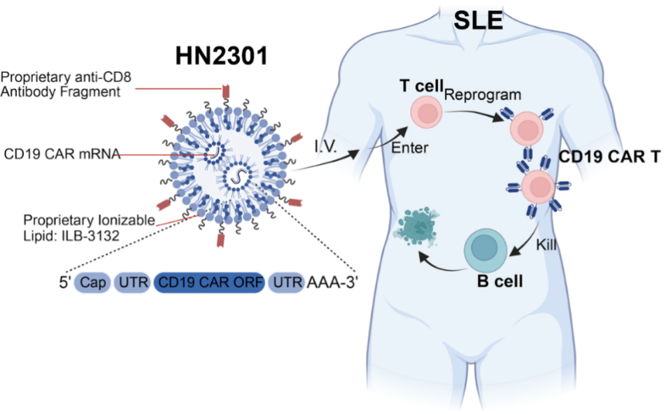 图1 HN2301体内原位生成CD19-CAR T细胞治疗SLE机制示意图