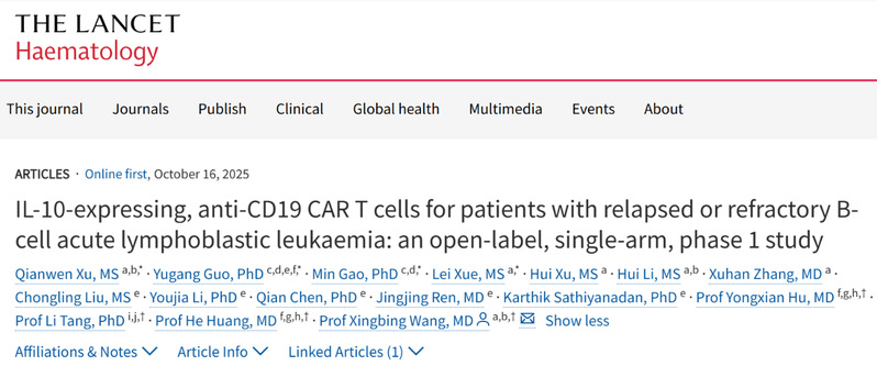 北京时间2025年10月17日,中国科大附一院(安徽省立医院)血液内科王兴兵教授团队在血液学国际顶级刊物《柳叶刀-血液病学》(The Lancet Haematology)在线发表全球首项IL-10自分泌型CAR-T细胞(IL-10 CAR-T)疗法治疗复发/难治性B-ALL患者的1期临床研究——IL-10-expressing, anti-CD19 CAR T cells for patients with relapsed or refractory B-cell acute lymphoblastic leukaemia: an open-label, single-arm, phase 1 study。该研究首次报道了靶向CD19的IL-10 CAR-T在复发/难治性B-ALL患者中的突破性临床疗效和优异的安全性,为全球复发/难治性B-ALL患者带来新的希望。
